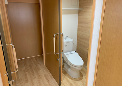 トイレにはウォシュレットを設置し、暖房機の燃料は現在最も安い都市ガスを配備しています。バリアフリー設計で車いすの相互通行が可能です。万一転倒してもけがの少ない床材を採用しています。