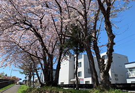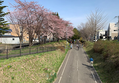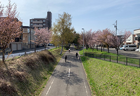建物前のサイクリングロードでは車を気にせずに散歩やウォーキングが出来ます。